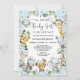 Celebrar a chegada da sua pequena selvagem com este convite temático de chá de fraldas da selva balnear safari. O design apresenta um grupo de adoráveis animais safari e bonito flores azuis e verde-azul-aquarela