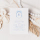 Mínimo azul-esbranquiçado, a vintage inspirou o convite para chá de fraldas com uma crista de monograma desenhada à mão branca.