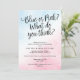 Este convite simples e moderno apresenta a tipografia da escrita preta e uma bela cor d'água de fundo em rosa e azul. Adicione suas informações no formulário de modelo. Use o recurso PERSONALIZAR MAIS para alterar o estilo e o layout da fonte ou para adicionar texto à parte traseira do convite.