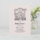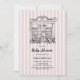 Uma mão branca desenhada por 'Cafe Bebe' Café francês inspirou um convite para chá de fraldas com um fundo de faixa macia e uma ilustração desenhada manualmente de um café em Paris.