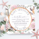 O convite para chás de fraldas da menina é bonito, com as flores cor-de-água rosa, conchas e folhas verdes de eucalipto sábias, com um anel de ouro rústico que enquadra seus detalhes de chá de fraldas. Perfeito para comemorações de temas costeiros, tropicais e de praia.