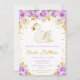 Este convite de chá de fraldas giro e caprichoso apresenta um elegante cisne e rosas roxos arranjos florais com falso confete dourado. O texto combina o script manuscrito e as fontes sans serif para uma aparência na moda e moderna. Isto é perfeito para um chá de fraldas temático cisne. Gráficos por Heideramalice e SunflowerDayLove