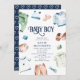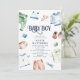 Convite De Chá de fraldas De Bebê Bonito. Apresentando um clássico fundo branco, uma fronteira de roupas de bebê doce, brinquedos de madeira e acessórios com um modelo elegante que pode ser facilmente personalizado com seus próprios detalhes de celebração.