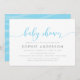 Convite para Chá de fraldas na moda com as palavras "Chá de fraldas" num script cursivo relaxado em azul claro contra fundo branco. A placa tem um verso azul claro com linhas sobrepostas. Personalize-o substituindo o texto do marcador de posição. Para obter mais opções, como alterar a fonte e seu tamanho/cor ou o espaçamento entre letras, clique no botão "Personalizar". *Observe que a Marca d'água do Zazzle que aparece na visualização de zoom NÃO aparecerá no produto impresso final. © Rosewood e Citrus