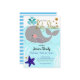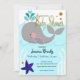 Chá de fraldas de baleia do mar náutico. Ajuste o texto para torná-lo seu. Mão desenhada, ilustração adorável de baleias. Tema azul claro e branco, fundo listrado constituem esse design de aniversário fofo. Chá de Bebê. Festa de garotos. Tema azul claro. Não é possível alterar o texto do chá de fraldas. O texto foi criado com uma cobertura de folha de ouro falsa.