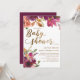 Belo e elegante burgundy / plum rople e rosa floral e verde-sábio folhas botânicas chá de fraldas de aquarela em fundo branco. O texto é uma fonte de pincel de caligrafia dourada e está alinhado no lado direito da placa.