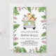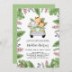 Personalize facilmente este belamente chamado convite à selva safari animal neutro em gênero para o seu chá de fraldas. O convite apresenta animais bonitos de safari: leão, macaco, girafa e elefante em um carro verde. O fundo é verde-claro sólido. Este convite também pode funcionar facilmente para uma festa de aniversário. Procure itens correspondentes no compro!