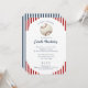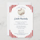 A Vintage inspirou o convite para o chá de fraldas do tema baseball com padrão listrado vermelho e azul com design de baseball e informações de registro no verso.