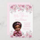 Celebre a chegada com nosso adorável convite para chás de fraldas, apresentando uma adorável menina africana americana vestida com uma roupa confortável de suéter rosa com arco rosa e calçados cor-de-rosa em um fundo floral de cor-d'água bonito. Perfeitamente concebido para captar a essência de uma ocasião alegre, este convite é ideal para qualquer chá de fraldas feminino. Personalize com facilidade e torne seu dia especial ainda mais memorável. Basta adicionar os detalhes do evento no estilo de fonte, texto e cor de fonte de sua escolha.