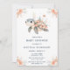 Um belo convite para chás de fraldas apresenta uma tartaruga com arranjos florais cor-de-rosa coral. Perfeito para um chá de fraldas. As palavras podem ser alteradas para se adequarem aos seus próprios detalhes ou requisitos