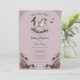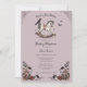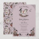Este Convite para Cavalos de Rocha Roxo Gótico, Rochedo a Chá de fraldas, apresenta ilustrações desenhadas à mão de um cavalo de balanço vitoriano de madeira, corvo negro, rosas, flores silvestres, folhagem, teias de aranha e morcegos voadores, todos contra um elegante fundo lilás cor-de-rosa. A parte traseira apresenta um padrão elegante com esses mesmos elementos. Todo texto é editável.