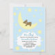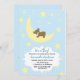 Um convite de chá de fraldas bonito com um ursinho de pelúcia descansando sobre a lua cercada por estrelas.