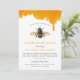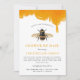 design de chá de fraldas com tema de abelha giro com ilustração de um abelhão com pingar mel no topo. Envie este cartão para convidados que não podem participar da festa por causa da distância, etc. Ele tem informações de registro e mensagens doces que incitam amigos e familiares a enviar presentes e amor por correio. Convide um chá virtual neutro em relação ao sexo enquanto você estiver seguro e distanciando-se da sociedade!