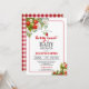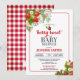 Chamadas de chá de bebê para picnic de morango doce e de verão. Apresentando uma adorável coloração aquosa, morangos e flores, com uma mesa de picnic clássica, vermelha e branca, marcada "cobrir" no verso.