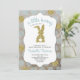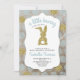 Um convite rústico maravilhoso de ouro e azul para um coelhinho no caminho!