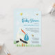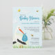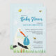 Um chá de fraldas de modelo de menino bonito e personalizável, com uma cegonha puxada pela mão com abelhas e borboletas em um campo e fundo azul-céu. Uma cegonha azul faz uma entrega especial de um bebê. Celebrar a chegada iminente do novo bebê com este cartão de convite para o bebê de cegonha giro. Personalize o convite com seu texto e informações.