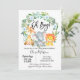 Animais Safari Wreath Chá de fraldas Convite para chá de fraldas de safari doce com tema de safari apresentando uma coroa com flores azuis bebê e três animais da selva fofinhos. Este design é excelente para rapazes da selva ou animais safari temidos chá de fraldas para um menino.
