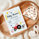 Este design de convite para chás de fraldas de garotos azuis bonitos apresenta desenhos animados de fazenda e um padrão de animais de fazenda, com um trator vermelho, vacas, porcos, ovelhas, frangos e flores, e pode ser personalizado com os nomes dos pais e quaisquer outros detalhes necessários para sua festa. A perfeita adição, simples e moderna, do tema da fazenda ao chá de fraldas russo dos casais de co-ed.