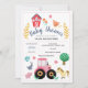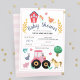 Este design de convite para chás de fraldas de meninas giras e bonitinhas apresenta animais de fazenda, com um trator rosa, cavalo, porco, coelho, galinhas, celeiro e flores, e pode ser personalizado com os nomes dos pais e outros detalhes necessários para sua festa. A fazenda perfeita para o chá de fraldas rusticado do casal.