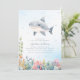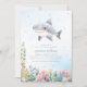 Um convite para chás de fraldas de tubarões super fofo. Um tubarão fofo toma o palco central neste convite à aquarela. Há também um polvo a espreitar do canto e pequenos cavalos marinhos num recife de coral! Este convite encantador é perfeito para uma festa temática do mar ou do oceano. Veja a coordenação de itens no nosso compro, Encantado Finch.
