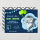 Incomode seus convidados com este legal convite para chás de fraldas com um tubarão fofo segurando balões verdes com tipografia moderna contra um fundo azul marinho. Basta adicionar os detalhes do seu evento neste modelo fácil de usar para torná-lo um convite de tipo único. Sacudir a placa para revelar um padrão de chave de cinza elegante na parte traseira da placa.