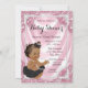 O chá de fraldas cor-de-rosa e preto, com uma adorável menina hispânica, indiana, africana-americana, vestindo um tutu preto e uma corda de pérolas num lindo fundo cor-de-rosa e branco de pérolas. Este elegante convite de chá de fraldas de pérolas de folha cor-de-rosa girado é facilmente personalizado para o seu evento simplesmente adicionando os seus detalhes no estilo de letra da sua escolha. Este é um design impresso sem pérolas reais, cetim, etc.