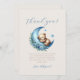 Este cartões de agradecimentos de chá de fraldas bonito apresenta um doce ursinho d'água adormecido em uma lua azul crescente decorada com flores azuis, abaixo das palavras "obrigado you" em roteiro azul de escrita manual. Personalize o texto com a sua mensagem na fonte sans serif e na linha de assinatura no script em um plano de fundo bege. Ideal para o chá de fraldas de um menino.
