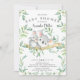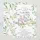 Chá de fraldas bonito com um doce bebê Koala com a mãe enquadrada com folhas naturais verdes de aquarela. Sacudir nosso convite para ver uma folha verde correspondente para um toque especial extra.