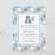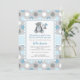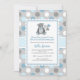 Este chá de fraldas bonito para um garoto mostra um doce ursinho de pelúcia segurando balões com fundo bolinhas em azul e cinzas. O design traseiro é uma faixa azul e branca que corresponde à frente. Todo o texto é editável para que você possa personalizar este design para suas necessidades exclusivas.