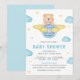 Incêndios aos seus convidados com este elegante chá de fraldas, convidam com um ursinho de pelúcia giro voando num avião entre nuvens com tipografia moderna. Basta adicionar os detalhes do seu evento neste modelo fácil de usar para torná-lo um convite de tipo único.