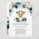 Mão bonita pintada ilustrando uma vaca de terras altas com lindas cores azul-lacrimogênea e cor-de-água floral rosa-esbranquiçada. Este convite é perfeito para um chá de fraldas de menino ou menina!