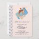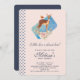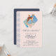 Um veado bonito e castanho com uma mancha branca. Um passarinho sentado nas costas do veado. Um buquê floral de rico em rosa pastel e verde. Um retângulo azul atrás da imagem. Uma borda bolinhas ao longo do lado esquerdo. Inocente e design doce. Personalize com os detalhes do seu chá de fraldas.