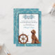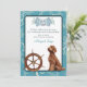"Um marinheiro está a caminho, comemora-se o vamos com um dia especial!" Este adorável convite para chás de fraldas náuticos apresenta um Goldendoodle marrom, roda do navio, detalhes da bolha de água girando e faixa azul de gravata. Perfeito por celebrar um menino no caminho!