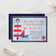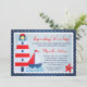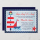 chá de fraldas bonito para rapazes com tema de navegação. Um padrão de bolinhas azul e branco no fundo do oceano; Ilustrado com um veleiro, uma estrela e um farol. Escrito "naves ahoy! é um garoto!". Alguns elementos de Baby Star Design.