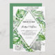 Convide a família e os amigos para o seu evento com este convite de brunch de chás de fraldas tropicais personalizável. Apresenta uma moldura tropical aquosa de folhas de monstera, folhas de palma e folhas de bananeira com falso sotaque de folha prateada. Personalize adicionando nomes, data, hora, local e outros detalhes do evento. Este convite tropical é perfeito para chás de fraldas de verão.