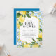 Convite para chás de fraldas sobre o tema limão, com ilustrações de aquarelas dos limões, flores de limão e padrão de azulejo mediterrânico. Personalize adicionando nomes, data, hora e outros detalhes. Este chá de fraldas de limão é perfeito para casamentos de verão e chás de fraldas temáticos mediterrânicos.