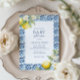 Anuncie sua celebração pela chegada do seu pequeno com este convite para chá de fraldas azul. O limão de aquarelas e o design azul de azulejo para este convite para chás de fraldas de citrinos vão perfeitamente corresponder ao seu chá de fraldas de Verão, chá de fraldas italiano ou decor de chá de fraldas mediterrânico!