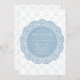 Centro de rendas azul com fontes brancas em um fundo de coordenação azul e branco. Um convite perfeito para um evento perfeito. Estilo neutro em termos de gênero. 100% de satisfação do cliente na Zazzle todos os dias.