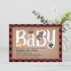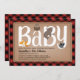 É inspirado um convite de chá de fraldas com a ilustração de uma raposa, urso, coruja e guaxinim que repousa no texto "BABY". Borda e reverso são xadrez de búfalo vermelho e preto.