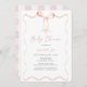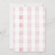 O convite para chá de fraldas desta jovem elegante apresenta uma delicada fita/arco de rosa claro e uma estrutura ondulada. O verso apresenta um fundo branco com verificação/xadrez de gingham rosa-bebê.