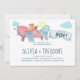 O convite para chá de fraldas de Watercolor apresenta um esquilo giro voando num avião vintage puxando um banner "It's A Boy!", com um pano de fundo de um sol amarelo e nuvens azuis lisas. Perfeito para a aviação, animais florestais, viagem e chás de fraldas temáticos de aventura. Trabalho de arte por KL Stock.