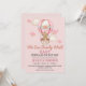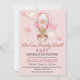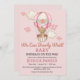 Óptica ilustração de um bebê urso num balão cor-de-rosa com nuvens e aves. O fundo é rosa pálido
