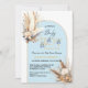 Um belo convite de chá de fraldas com um tema do deserto. A frente deste cartão é embelezada com um buquê de aquarela pintado manualmente e apresenta folhas de palma secas, verde de eucalipto, orquídeas brancas, florais azuis e grama de pampas. Os detalhes do evento são impressos à direita, abaixo, numa combinação de belos escritos, letras manuais e tipografia serif tradicional. No mesmo azul-sonho que as flores está escrito o nome da mãe. Ao contrário, as placas apresentam um design de diamante branco sobre um fundo azul. Perfeito para as estações de verão, outono, inverno e primavera