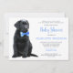 Convide seus amigos e família para comemorar a chegada de seu novo bebê com este adorável convite de chá preto de filhotes em laboratório, acessórios de festas e presentes. Um doce menino labrador negro e recuperador de filhotes em uma gravata azul de arco. Este design simples e mínimo é perfeito para qualquer chá de fraldas temático de cachorros. COPYRIGHT © 2020 Judy Burrows, Black Dog Art - Todos Os Direitos Reservados. Convite para Chá de fraldas do Black Lab Puppy Dog Blue Boy