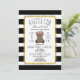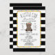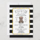 Um convite para o chá de fraldas com a ilustração de um urso bebê vestindo uma coroa de flores rosa. Personalize o texto. O fundo é um padrão listrado preto e branco com pom poms design.