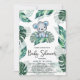 O convite de chá para o bebê apresenta um lindo urso de aquarela em folhas tropicais e quadros tropicais. Personalize com seus detalhes em letra maiúscula em bloco.