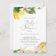 Este chá de fraldas de limão é perfeito para um chá de fraldas de primavera ou de verão. O design mediterrânico rústico apresenta limões aquosos brilhantes e bonitos com flores brancas boêmicas e folhas verdes elegantes.