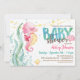 Cavalo rosa sob o convite do chá de fraldas oceânico. Possui o mar cor-de-rosa e o azul-aqua, cores verdes com aspecto aquarela.