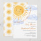 Você está planejando um chá de fraldas temático? O chá de fraldas de um garoto giro apresenta o texto "Nosso pequeno raio de sol está quase aqui!" com uma aquarela sorrindo sol amarelo e nuvens azuis. As costas estão decoradas com um padrão solar. Facilmente personalizável. Original Watercolor © Michele Davies.