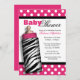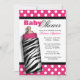 Convites à moda do chá de fraldas projetados com as bolinhas brancas sobre o rosa quente, e a caracterização de uma garrafa de bebê do impressão da zebra.